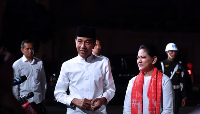 TIMES Majalengka/Capres nomor urut 01 Joko Widodo bersama istri Iriana Joko Widodo tiba di lokasi untuk mengikuti debat Pilpres 2019 putaran kelima, di Hotel Sultan, Jakarta, Sabtu (13/4/2019). (FOTO: Rivan Awal Lingga/Antarafoto)